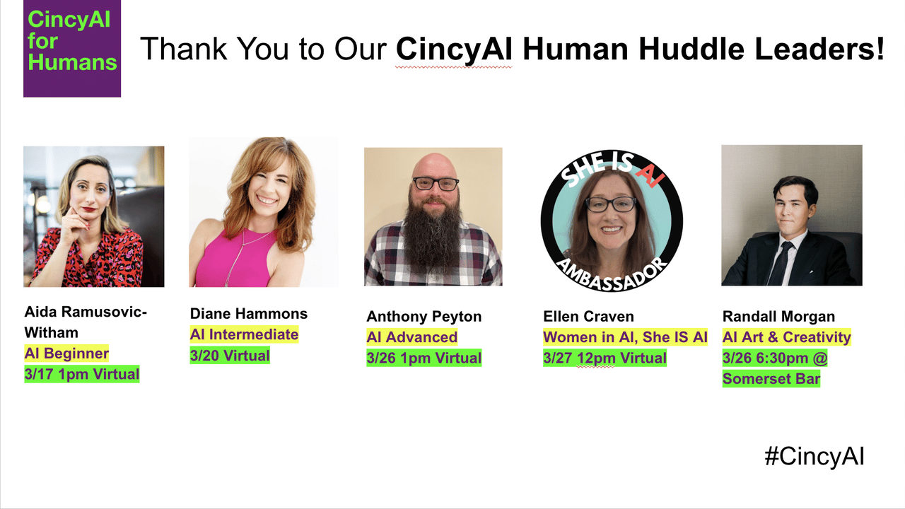 Women in AI CincyAI Directory — In addition to our Women in AI Human Huddle peer interest group, we’re launching a Women in AI Directory. This is for female speakers, mentors, founders, business leaders, builders, and curious learners. The intention of this list is to increase visibility and participation of Women in AI in the Greater Cincinnati and Tri-State region. Be part of the directory today!