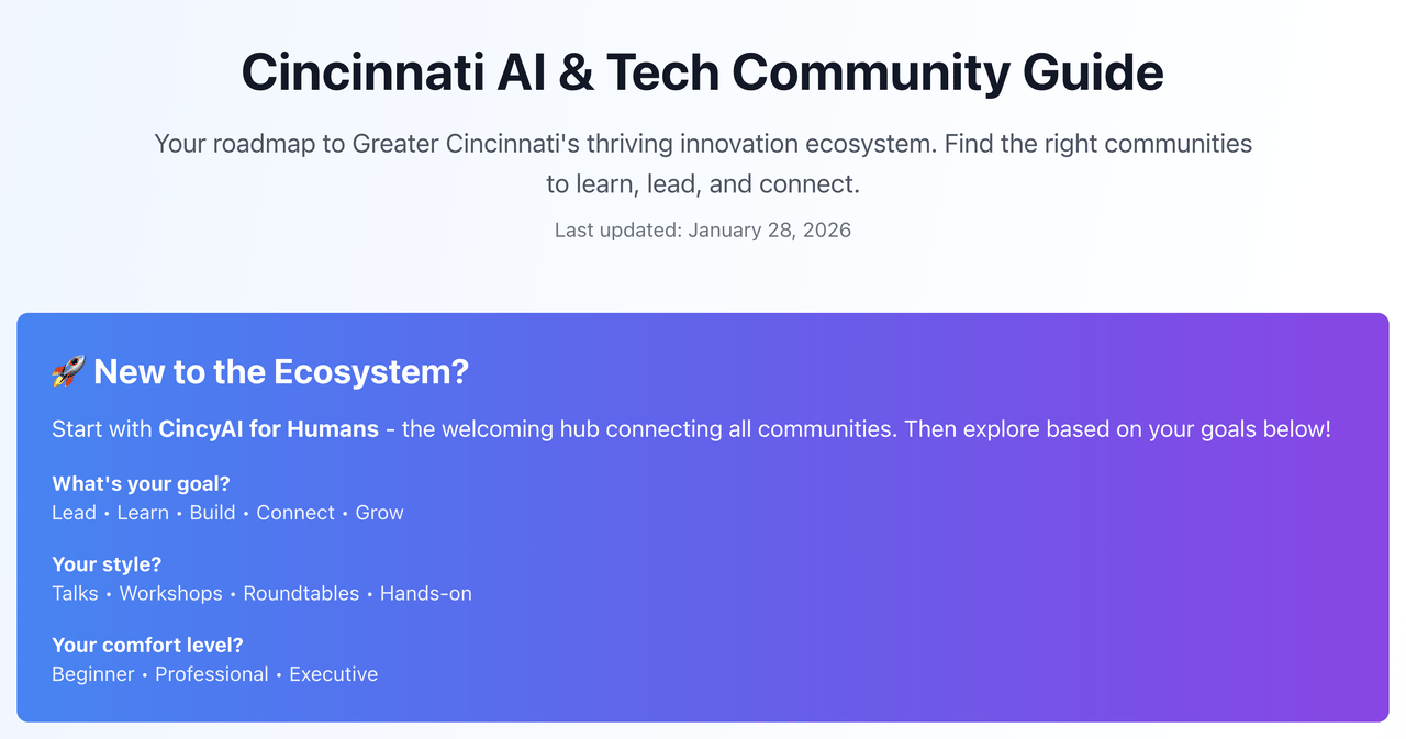 Cincinnati AI & Tech Guide — Don’t know where to start? Check out our new to the ecosystem guide that Kendra Ramirez spearheaded!